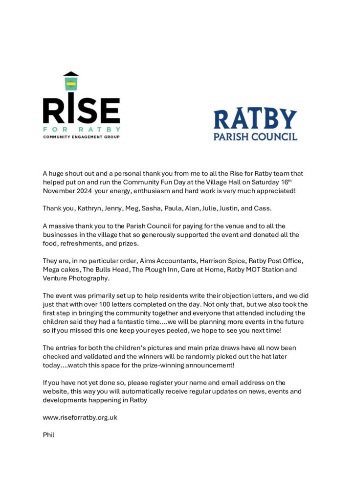If you need help or have any questions, please get in touch via the Rise for Ratby website www.riseforratby.org.uk and please do not forget to register at the foot of the home page, you will receive regular updates and news direct to your email.